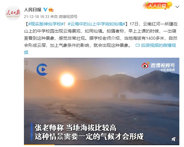 【现实版神仙学校!云海中的山上中学宛如仙境】17日,云南红河一所建在山上的中学校园出现云海景观,如同仙境。拍摄者称,早上上课的时候,一出寝室看到这种景象,感觉非常壮观。据学校老师介绍,当地海拔有1400多米,自然会形成云层,加上气象条件的影响,就会出现这种景象。