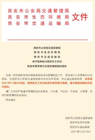 为进一步加强新型冠状病毒感染的肺炎疫情防控工作,有效减少人员聚集和交叉感染,经西安市公安局交通管理局与市生态环境局、市交通运输局会商,决定自2021年12月20日起,暂停执行工作日机动车尾号限行措施,限行措施恢复时间另行通告。