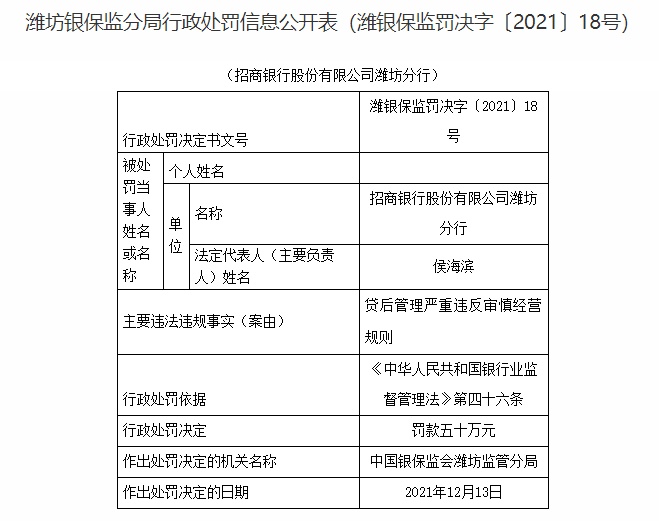 公告显示,招商银行股份有限公司潍坊分行存在贷后管理严重违反审慎经营规则的主要违法违规事实,依据《中华人民共和国银行业监督管理法》第四十六条,中国银保监会潍坊监管分局对其处以罚款五十万元的行政处罚。