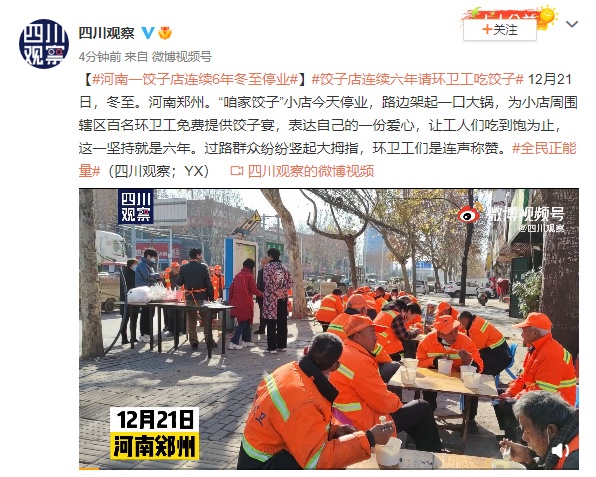 【河南一饺子店连续6年冬至停业】12月21日,冬至。河南郑州。“咱家饺子”小店今天停业,路边架起一口大锅,为小店周围辖区百名环卫工免费提供饺子宴,表达自己的一份爱心,让工人们吃到饱为止,这一坚持就是六年。过路群众纷纷竖起大拇指,环卫工们是连声称赞。