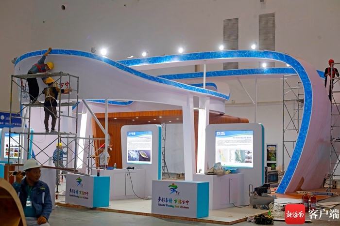记者了解到,万宁馆位于8号馆,整体造型设计为一艘“海钓船”的造型,又加入了冲浪、海钓等元素。从布局上来看,展区集展示、体验、休闲、洽谈于一体。内部的休息舱是一个休闲娱乐体验馆,可以体验冲浪、海钓产品,外围是万宁四宝海产品(和乐蟹、马鲛鱼、对虾、后安鲻鱼)的展示区。