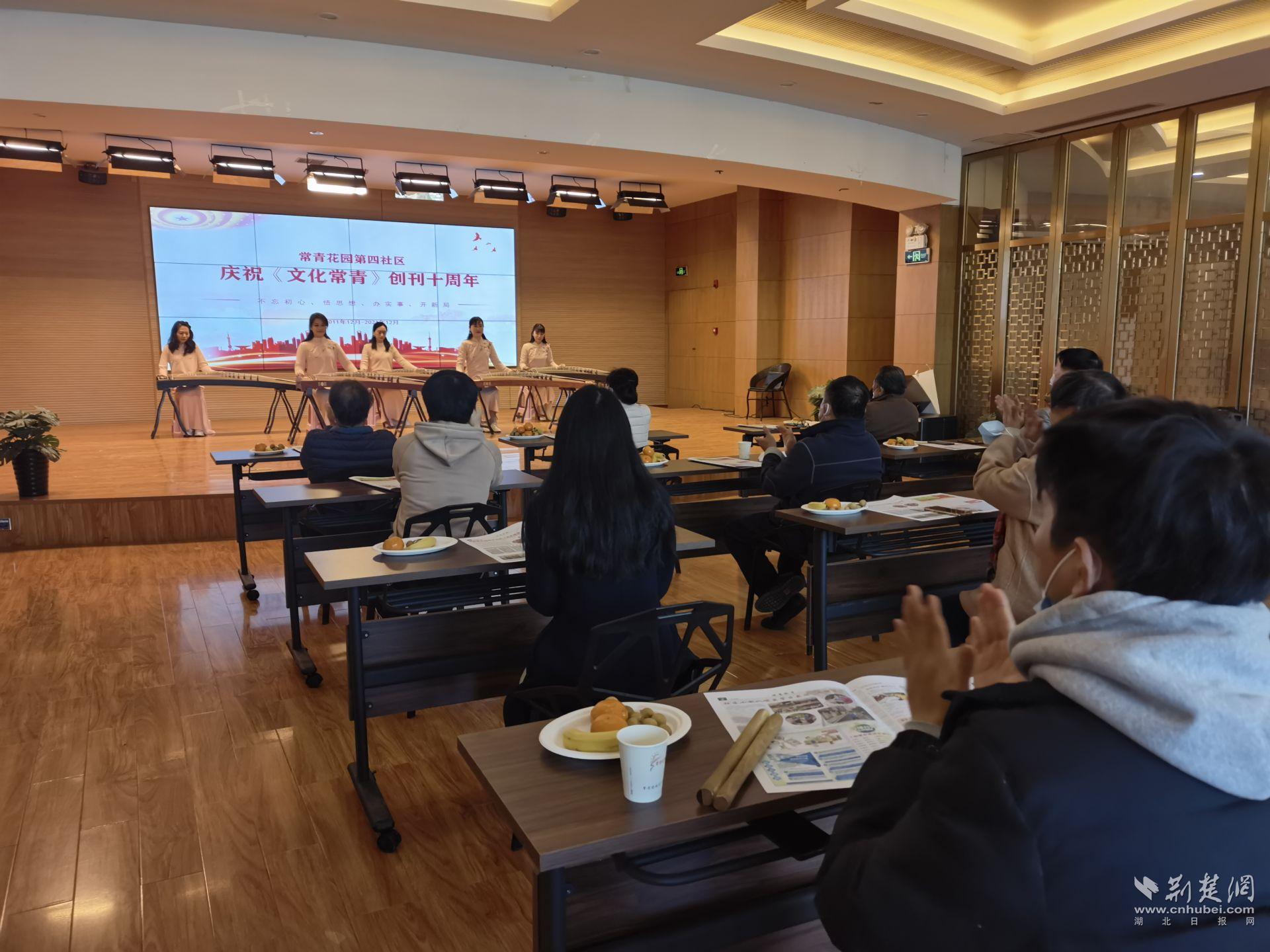 为庆祝《文化常青》报创刊十周年,社区文艺爱好者带来了古筝表演《我的祖国》,筝音悦耳,民族文化与爱国之情相交融,为大家带来了一场视听盛宴。接下来,到场人员均领取了《文化常青》报创刊十周年纪念笔记本,社区特别定制了《文化常青》报创刊十周年生日蛋糕,让大家一起分享了喜悦和美好。