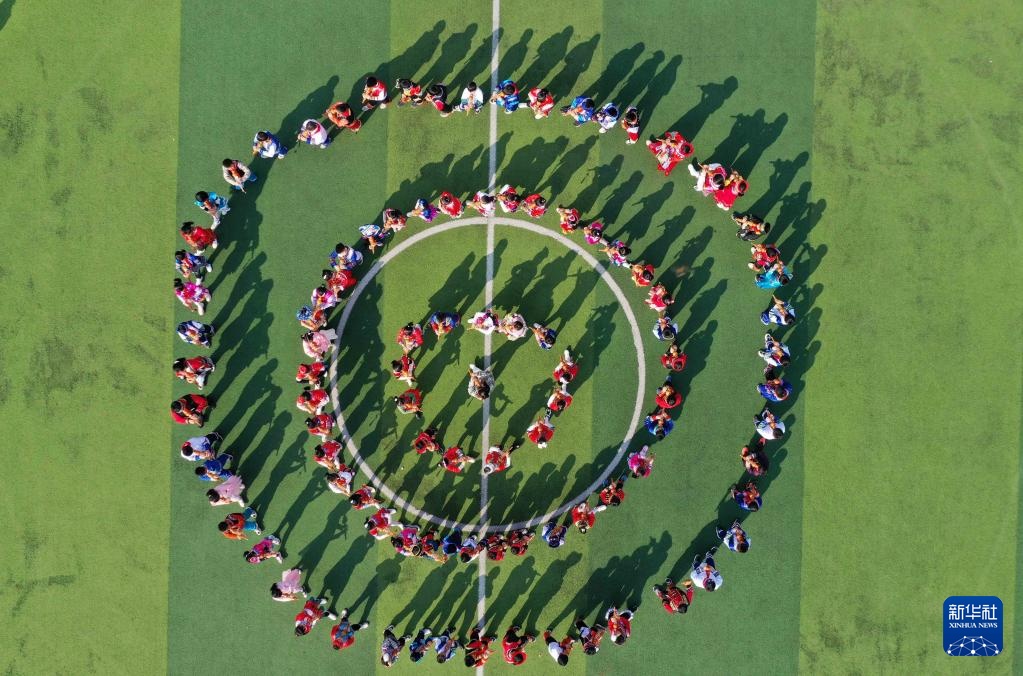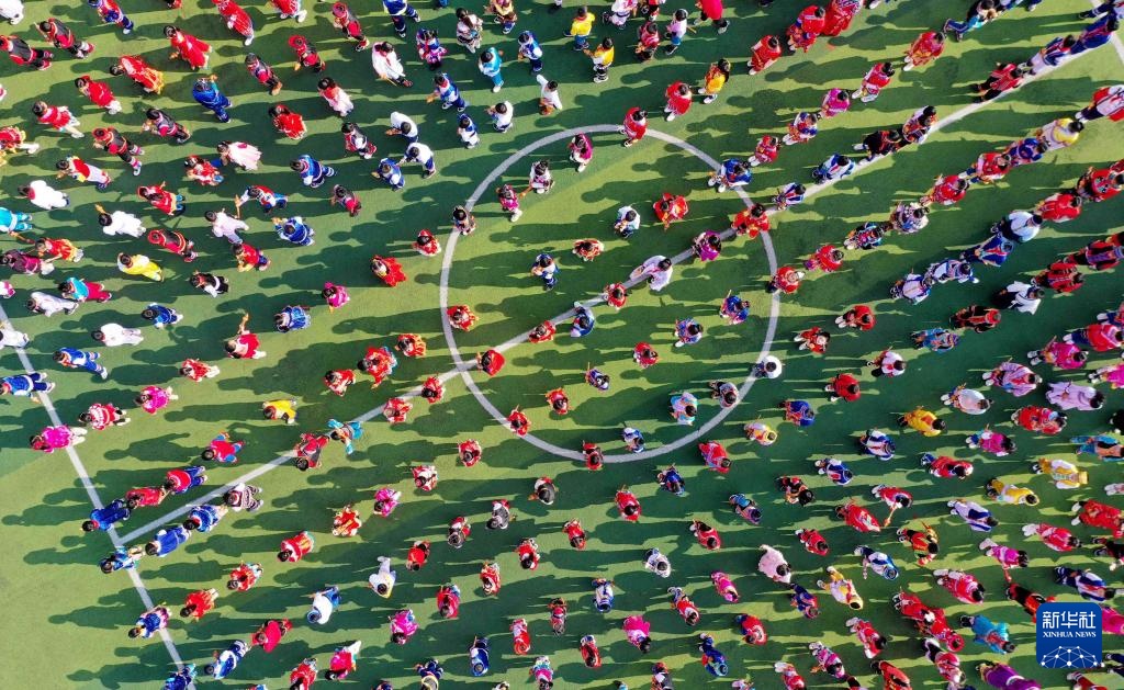 12月23日,在广西柳州市融安县实验小学,学生们在阳光大课间活动中演奏葫芦丝(无人机照片)。