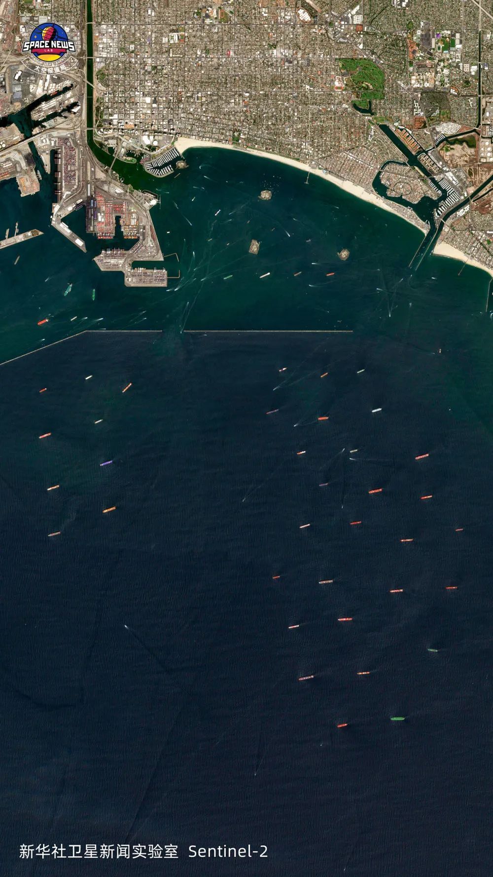 2021年9月5日,美国洛杉矶港外海面无法进港的大型油/货轮。受疫情等多种因素影响,美国的物流与供应链出现严重危机,导致全国性商品短缺和物价上涨。