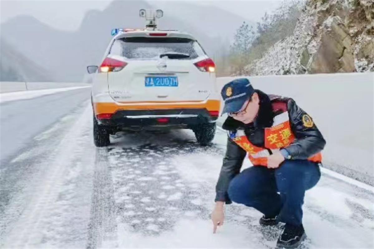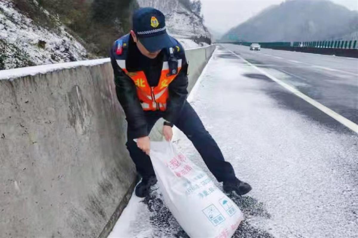 上车后,她查看温度计并做记录,路面气温0℃,桥上气温-3℃,小雨微风。“不妙,这样的数据不一会就要结冰了!”当巡查至罗沟一号大桥时,王梦醒向大队负责人范昊汇报。不到半小时,养护部门的融雪剂洒布车到达现场,养护、交警30余人的抗雪“大军”各就各位。