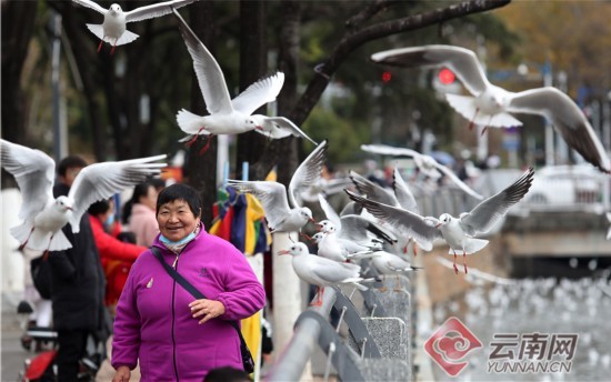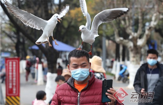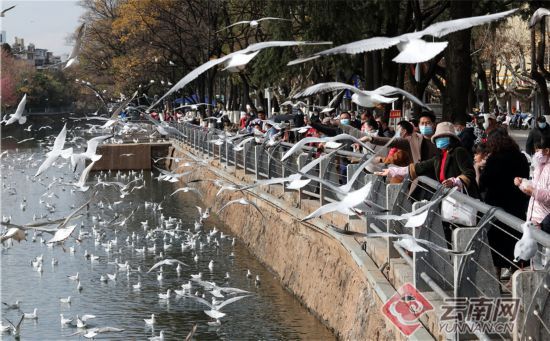 在大观河环西桥,春城市民和红嘴鸥共度冬日快乐时光。经过昆明市林草系统、昆明市鸟类协会联合对全市67个红嘴鸥栖息觅食地开展的的同步普查统计,今年共有44000只红嘴鸥来昆明过冬,数量创历年之最。