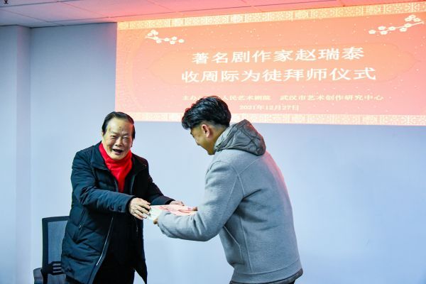 长江日报大武汉客户端12月27日讯(记者万旭明 通讯员蒋艳丽)27日,一场简洁但庄重的拜师仪式在武汉人民艺术剧院举行。著名剧作家赵瑞泰将武汉人艺青年演员周际收入门下,不仅将传承其创作经验,也将传递“为人民写戏”的艺术追求。