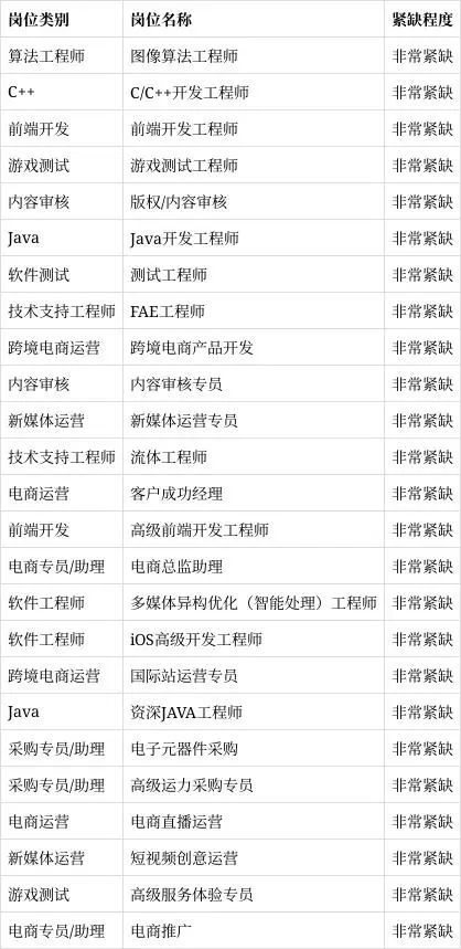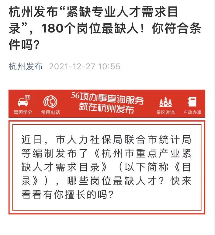 杭州市人力社保局、市统计局等日前发布紧缺人才需求目录,其中,游戏测试、算法工程师、运维工程师、机械研发工程师、医药技术研发、临床研究、主持人、后期/剪辑/特效、编剧、民宿运营、西点师、调酒师、操盘手、保险业务等岗位“非常紧缺”。