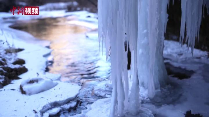 12月27日,摄影爱好者在森林公园内拍摄到山谷银装素裹、小路幽径崎岖。高耸坚硬的冰瀑矗立于悬崖之上,晶莹剔透的冰柱宛如水晶,熠熠生辉。洁白无瑕的霜雪为山川万物披上银白的外衣,潺潺流水明净碧绿、折射出五彩斑斓的光韵,宛如神话中的“白色王国”。(李隽 李长钰 申文昌 制作 隋致远)