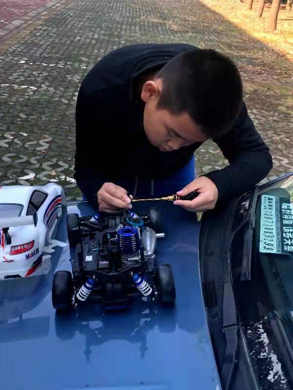 在四年级的时候,刘鸣谦成为武汉大学第一附小遥控模型车辆社团成员,爸爸给他买了人生第一辆参赛车辆“足球小子”,妈妈带着刘鸣谦去见了老师。老师叫王任虎,王老师带刘鸣谦走进遥控模型车辆的世界,从理论到操控、从驾驭到调教维修……虽然只是第一次的见面,老师和学生都觉得有默契,他们聊的内容全是汽车自动挡和手动挡的区别、齿轮比、轴距……老师欣喜10岁的孩子这么了解车,学生觉得老师就是“懂车帝”……