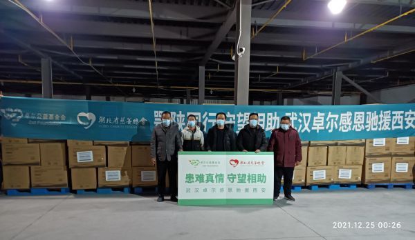 12月22日下午,西安宣布全面加强管控措施,全市小区、单位实行封闭式管理。卓尔公益基金会迅速启动援助行动,紧急筹措价值50多万元的热干面、医用外科口罩、医用隔离服、植物药方抗疫饮品等防疫生活物资,通过湖北省慈善总会和陕西省慈善总会捐赠到西安抗疫一线。经过10多个小时的风雪兼程,一台满载着首批23万件防疫生活物资的大货车于25日中午抵达古城西安。