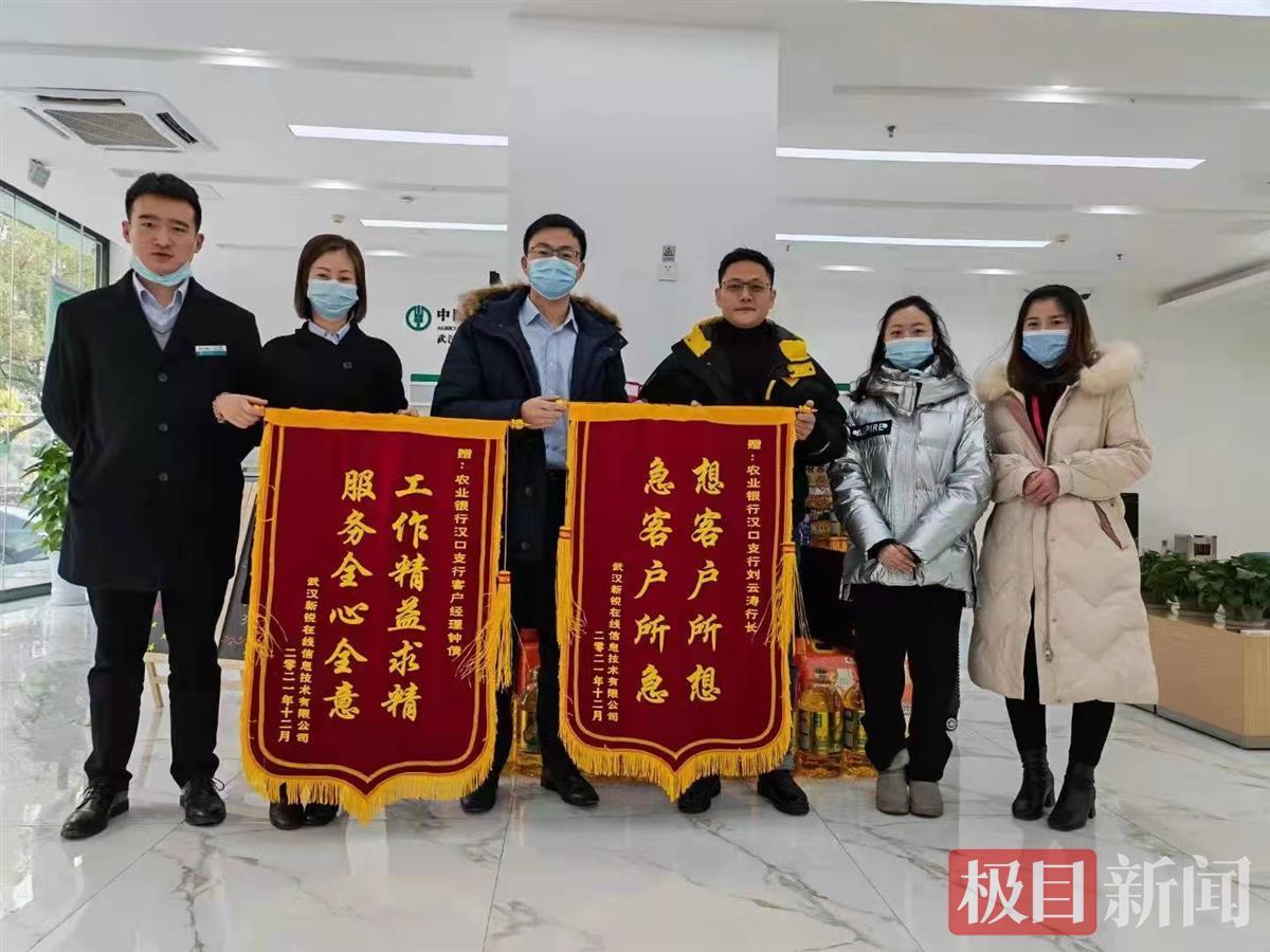 “你们不仅服务态度好、效率高,还时时刻刻想着我们的事,为你们点赞!”12月28日下午,武汉新锐在线信息有限公司董事长王涛冒着严寒,来到农行武汉分行营业部汉口支行营业大厅,将两面锦旗交到网点负责人刘云涛手中。展开锦旗,分别书写着“想客户所想,急客户所急”“工作精益求精,服务全心全意”等醒目的金色大字,吸引了不少客户的围观与称赞。