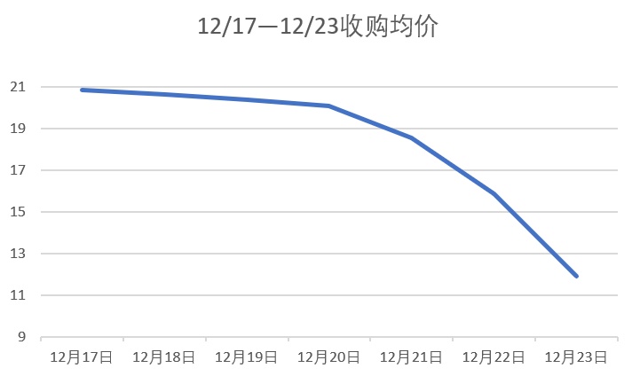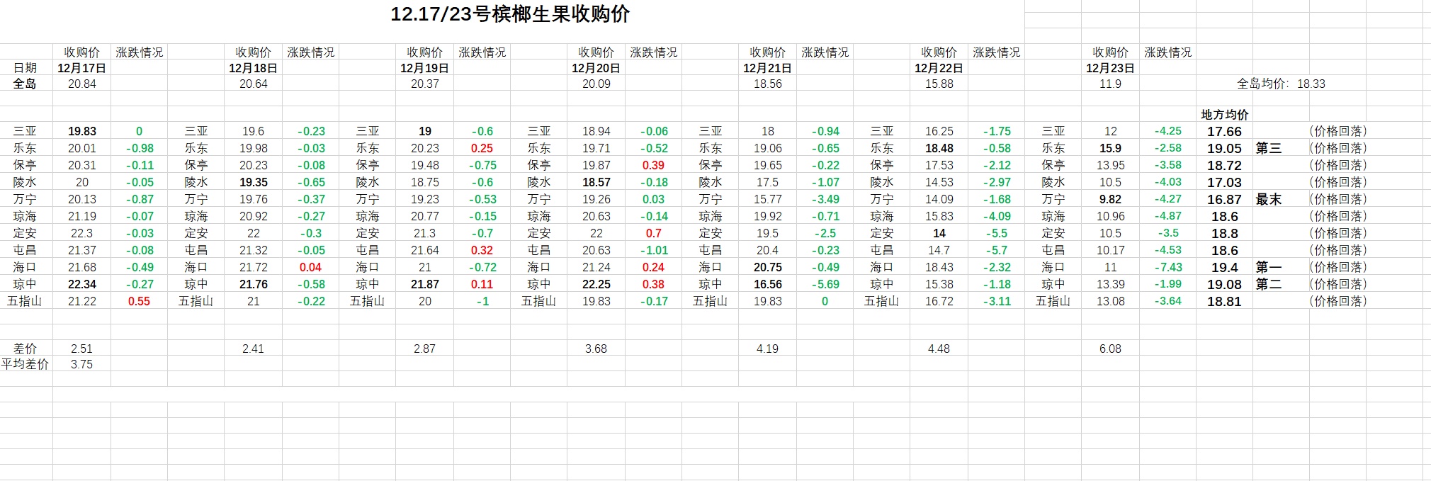 本周12月17日—12月23日,海南槟榔生果价格出现断崖式下跌。本周全岛生果平均价格为18.33元/斤,比上周全岛生果均价低2.66元/斤,周平均价格下跌14.6%。 12月17日到12月20日,全岛生果收购价稳定在20—21元/斤之间。12月21日,全岛生果收购价出现断崖式下跌;12月23日,全岛生果收购价为11.9元/斤,相比本周的第一天,全岛生果收购均价下跌了8.94元/斤。
