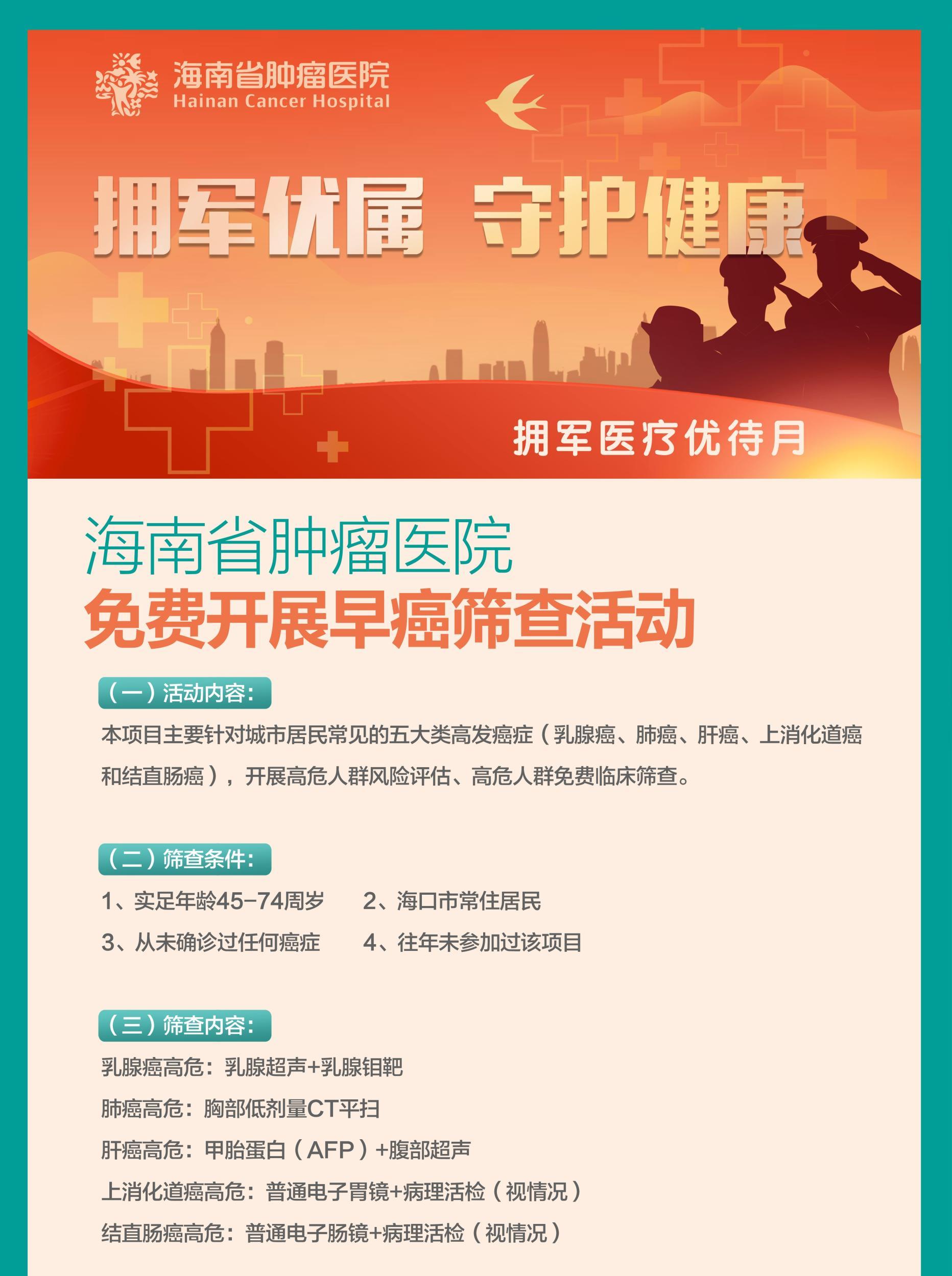 近日,海南省肿瘤医院启动了“拥军医疗优待月”活动,为全省退役军人和其他优抚对象免费提供早癌筛查服务。作为医疗服务示范单位之一,海南省肿瘤医院同期开展了肝癌、上消化道癌、肺癌、结直肠癌、乳腺癌等早期癌症免费筛查活动,凡海口市常住户口、年龄在45至74岁之间的退役军人和其他优抚对象,均可享受服务。该项活动时间将持续到2022年1月10日。