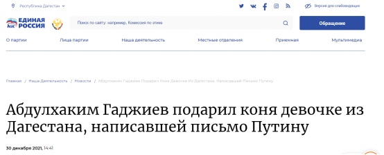 【环球网报道】统一俄罗斯党网站30日发布消息称,俄罗斯达吉斯坦共和国克孜勒尤尔特市一名14岁女孩本月给俄罗斯总统普京写信,请求赠送一匹马,因为她对障碍赛马感兴趣,也想从事这项运动。这封信随后被传达至当地政府,来自达吉斯坦共和国的俄国家杜马议员阿卜杜哈基姆·加季耶夫看到后完成了其愿望。最终,这名女孩在新年前夕如愿获赠一匹马,并给其取名“灰姑娘”。