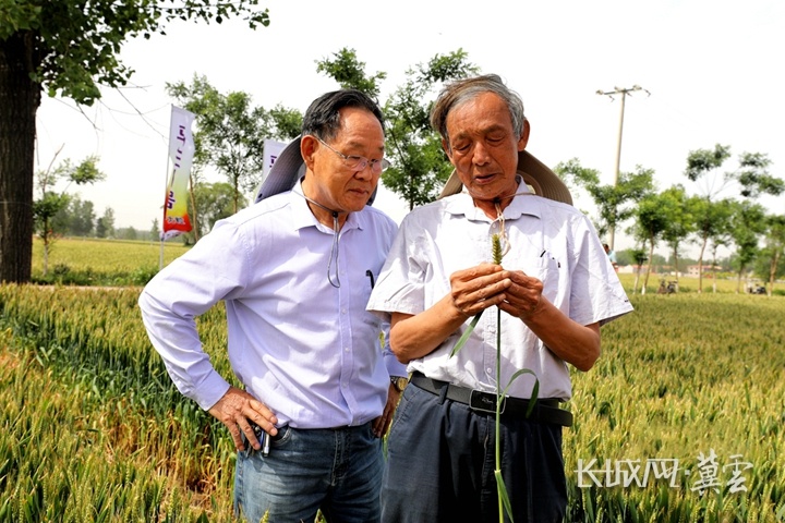 郭进考(右一)与石家庄市农林科学院研究员赵文庆(左一)在田间查看小麦长势。