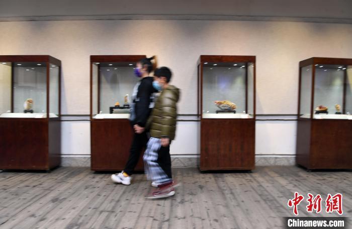 中国工艺美术大师叶子贤寿山石雕传承展吸引观众观看。 记者刘可耕 摄