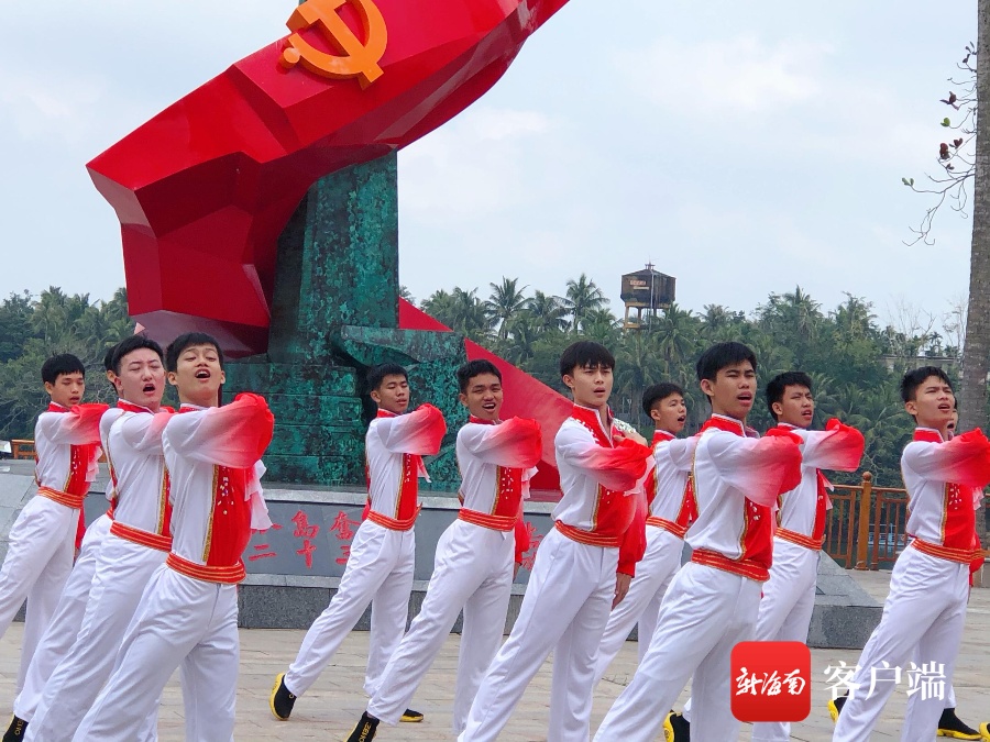 琼海嘉积中学、海南师范大学学生在琼海红色遗址椰子寨广场参与MV录制 颜业岸供图
