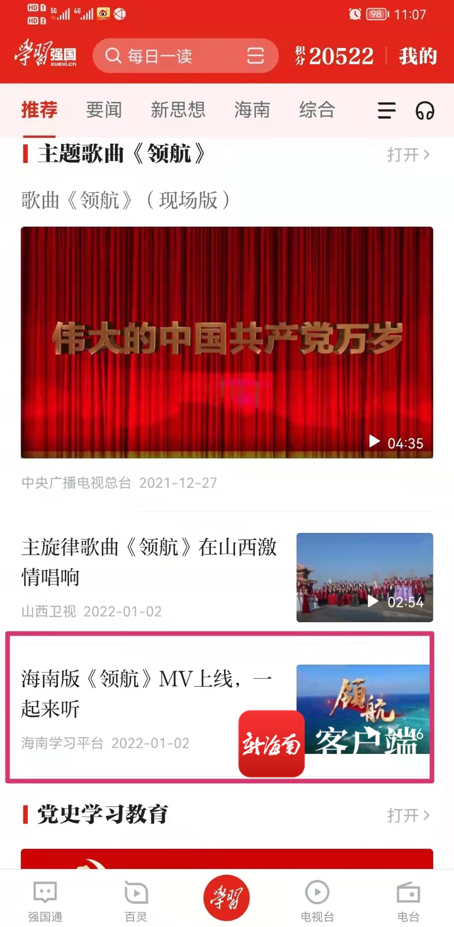 “中国梦”歌曲《领航》MV(海南版)获得“学习强国”总平台首页推荐