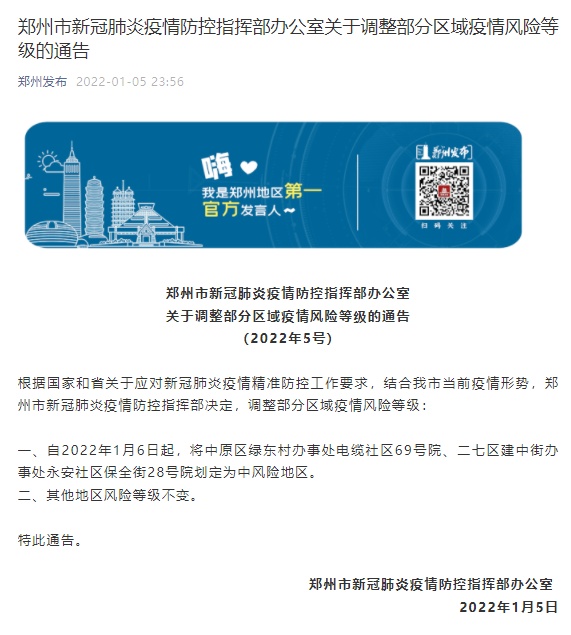 一、自2022年1月6日起,将中原区绿东村办事处电缆社区69号院、二七区建中街办事处永安社区保全街28号院划定为中风险地区。