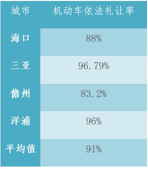 海南省四个地级市(区)机动车依法礼让率平均值为91%,其中三亚和洋浦机动车依法礼让率达到96%以上。