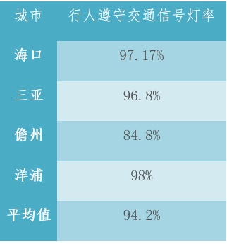 海南省四个地级市(区)行人遵守交通信号灯率平均值为94.2%,其中海口、三亚和洋浦行人遵守交通信号灯率达到96%以上。