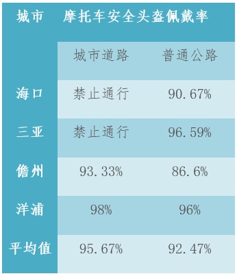 (1)城市道路摩托车安全头盔佩戴率平均值为95.67%,其中海口和三亚城市道路禁止摩托车通行,儋州和洋浦城市道路摩托车安全头盔佩戴率达93%以上;