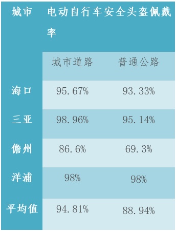 (1)城市道路电动自行车安全头盔佩戴率平均值为94.81%,海口、三亚和洋浦城市道路电动自行车安全头盔佩戴率均达95%以上;