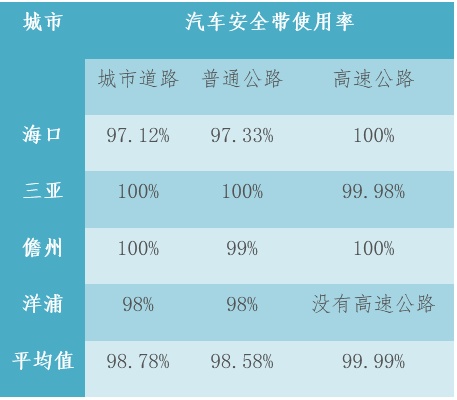 (2)普通公路汽车安全带使用率平均值为98.58%,其中三亚普通公路汽车安全带使用率达到100%,海口、儋州和洋浦普通公路汽车安全带使用率达到97%以上;