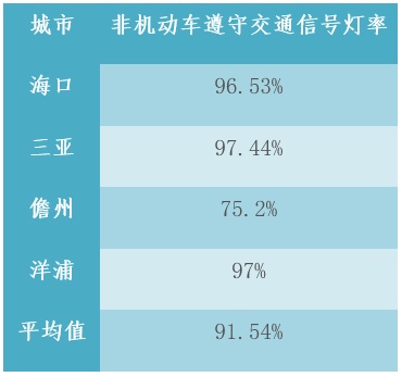 海南省四个地级市(区)非机动车遵守交通信号灯率平均值为91.54%,海口、三亚和洋浦非机动车遵守交通信号灯率均达到96%以上。