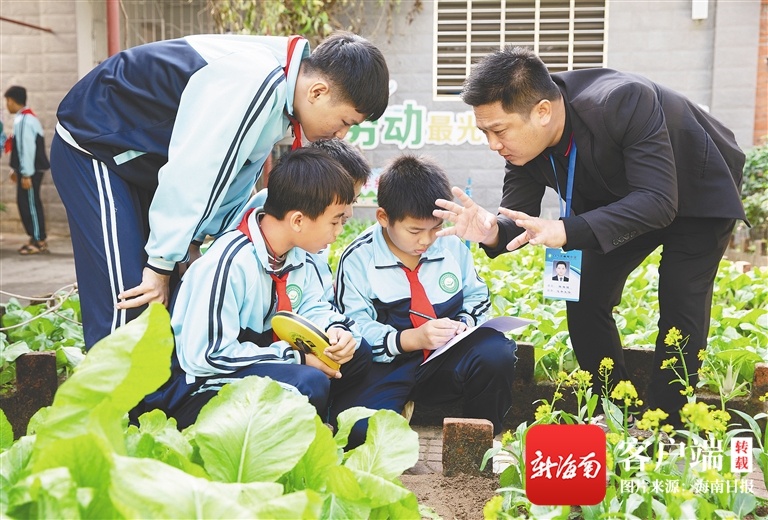 儋州市白马井镇藤根小学学生拿着卷尺测量计算菜圃面积。海南日报记者 陈若龙 摄