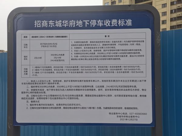 针对招商东城华府制定的停车收费标准,江夏区市场监管局在城市留言板回复称,藏龙岛招商东城华府开发商为武汉招平润丰房地产有限公司,小区有地下停车位3200多个,地下车库属于地下人防工程性质,其使用权归开发商所有。依据国家发展改革委《关于放开部分服务价格意见的通知》发改价格[2014]2755号文件第七条的规定,目前我市住宅小区停车服务收费标准已放开。小区停车费包含两部分收费:一是物业收取的停泊服务费,另一部分则是开发商收取的场地租赁费。