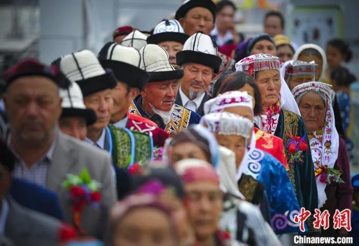 2014年7月28日,新疆尼勒克县13个民族的金银婚老人在集体婚礼上为各族新人送祝福。中新社记者 刘新 摄