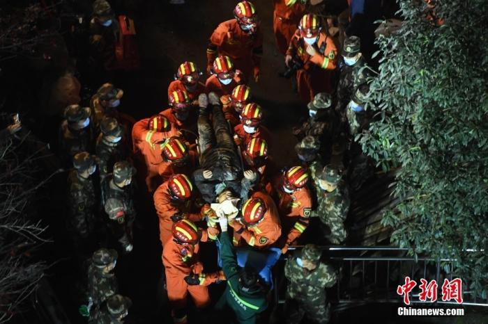 1月7日晚,重庆武隆食堂坍塌事故现场,一名生还者被消防员救出。 中新社记者 陈超 摄