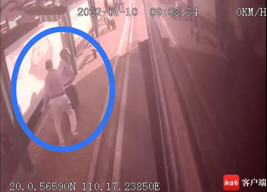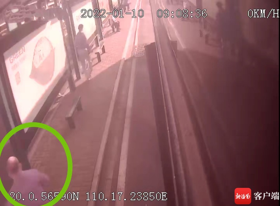 据了解,10日9时08分,李日伟驾驶一辆1路公交车抵达海口市秀英区政府公交站上下客,两名乘客依次从站台处走来准备上车,走在前面的是一名穿白色裤子的男性老年乘客,后面的是一名穿着灰色上衣戴着安全头盔的男子。