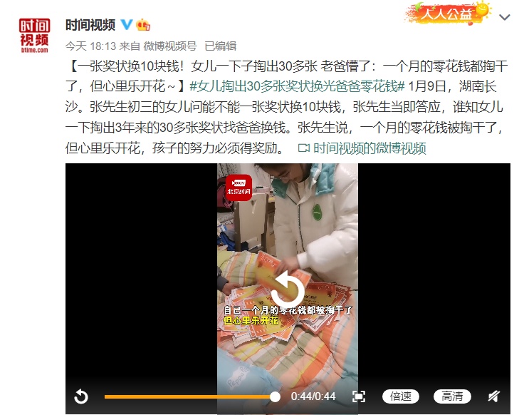 1月9日,湖南长沙。张先生初三的女儿问能不能一张奖状换10块钱,张先生当即答应,谁知女儿一下掏出3年来的30多张奖状找爸爸换钱。张先生说,一个月的零花钱被掏干了,但心里乐开花,孩子的努力必须得奖励。