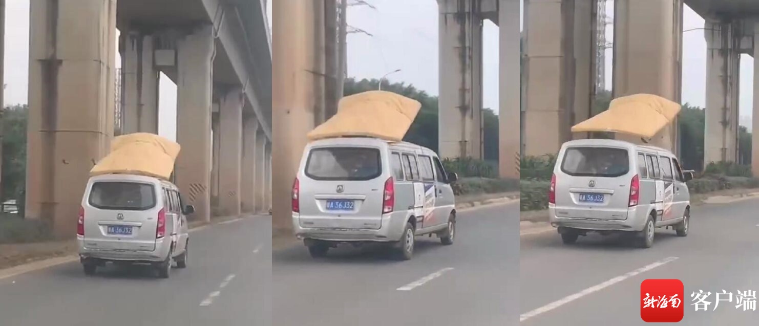 新海南客户端、南海网、南国都市报1月13日消息(记者 王燕珍)1月13日,有网友向新海南客户端、南海网、南国都市报爆料称,在海口市南海大道看到一辆面包车在车顶绑了一张床垫,随着车辆行驶,该床垫被大风吹得左摇右晃,好像一张“飞毯”,随时有掉下来的风险,看着十分危险。
