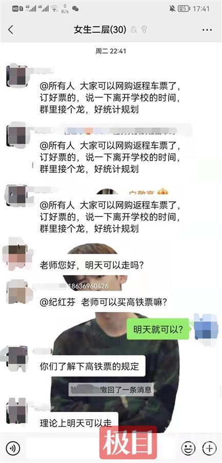 1月11日22时41分,在吴晓娜所在的“女生二层”30人的微信群里,收到了老师发来的可以返程的消息,群友们都异常激动。