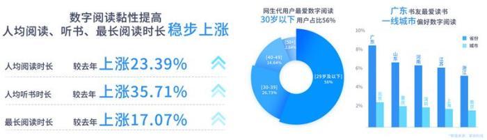 报告显示,2021年度掌阅平台用户数字阅读时间分布均匀,人均阅读时长、人均听书时长、最长阅读时长较上一年度分别上涨23.39%、35.71%、17.07%。从用户构成上看,30岁以下的网生代用户是平台数字阅读的主力军,占比达到56%。