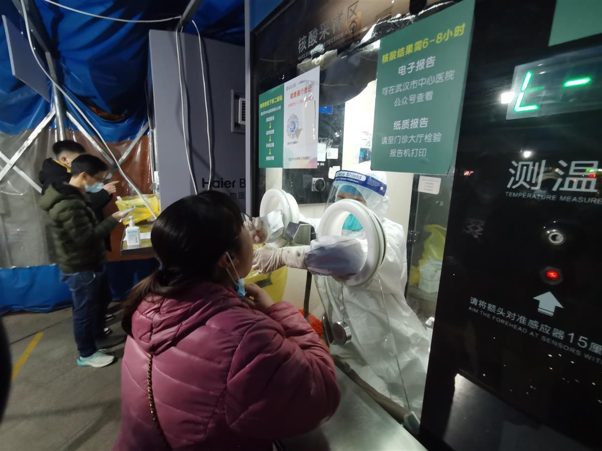 为应对春运期间核酸检测高峰,武汉市中心医院推出“一站式核酸采集”,提供24小时检测服务。需普通检测的市民可在医院微信公众号上自助预约开单,凭二维码到医院门诊广场随到随查,全程不用进入院内,即可完成检测,减少聚集风险。标本上机6小时完成检验,收到短信提醒后在线收取报告。