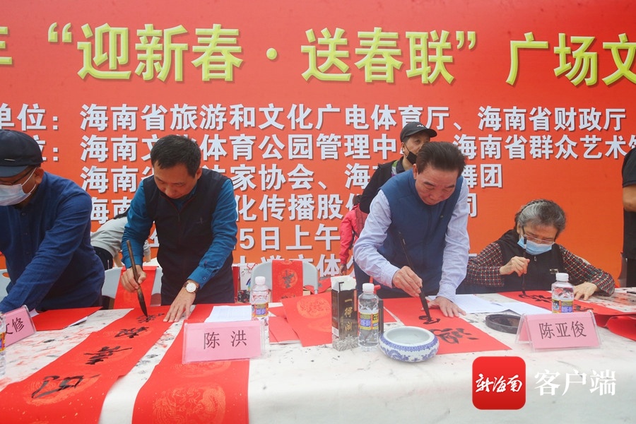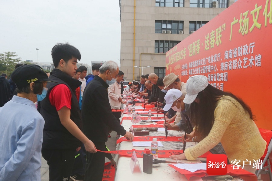新海南客户端、南海网、南国都市报1月15日消息(记者 陈望 )1月15日上午,文化进万家2022年“迎新春·送春联”广场文化惠民活动在海南省歌舞剧院广场举行。省内外30名知名书法家挥毫泼墨,免费为海口市民书写春联,送上一份浓浓的新春祝福和爱心。