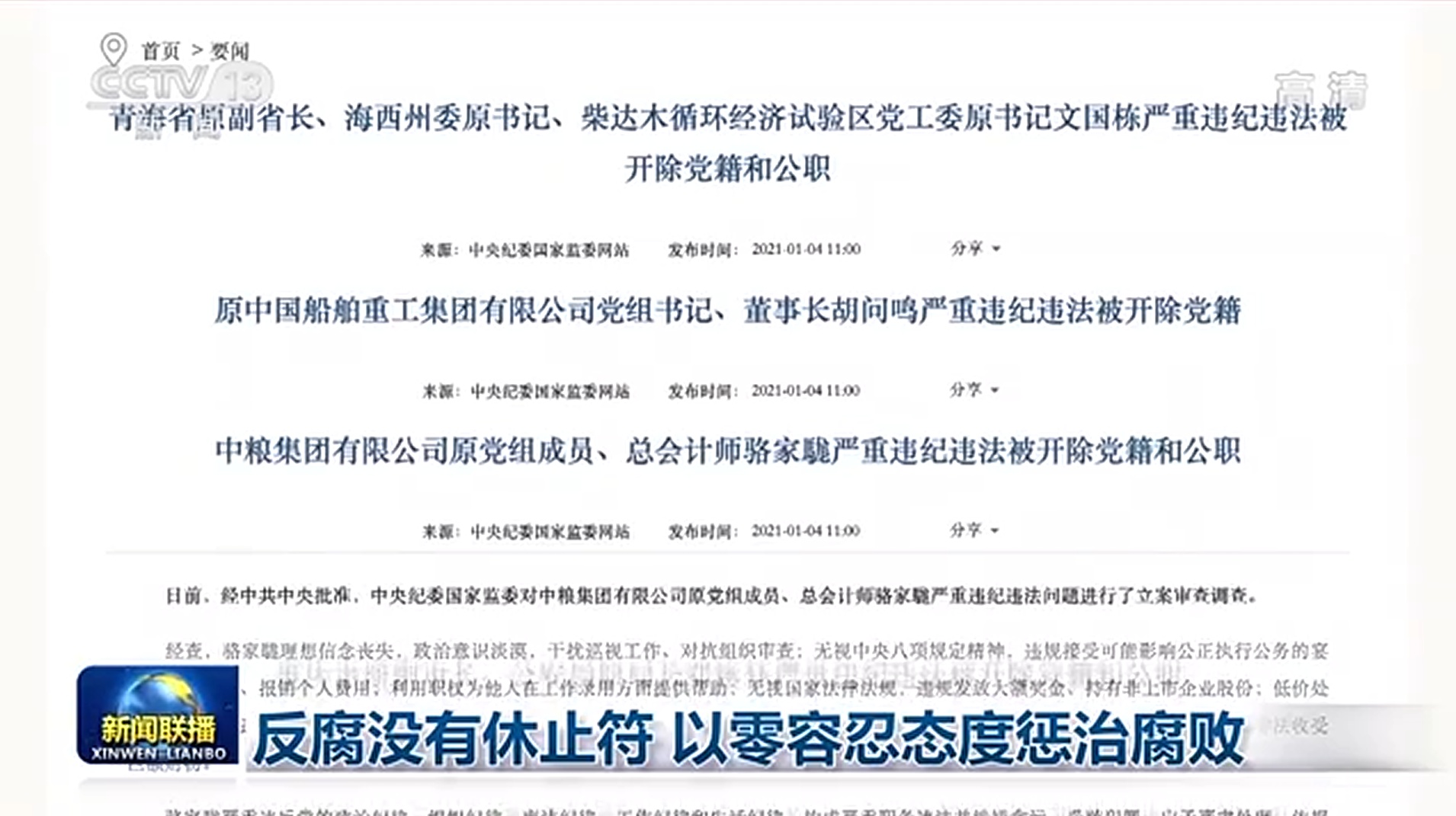 过去的一年,从年初开始,反腐不停步。2021年的第一个工作日,中央纪委国家监委连续通报青海省原副省长文国栋、原中船重工董事长胡问鸣、中粮集团原总会计师骆家駹、重庆市原副市长邓恢林等4名中管干部受到党纪政务处分的消息,再次体现了党中央保持惩治腐败高压态势的坚定决心。