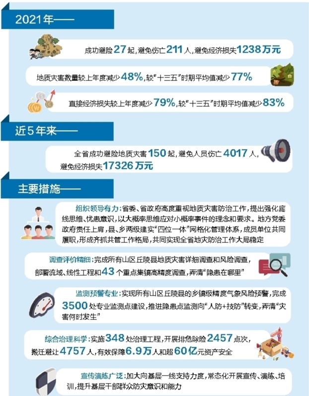 2021年是中国共产党建党100周年和“十四五”开局之年,安全稳定工作十分重要。全省自然资源系统牢固树立“以人民为中心”的发展思想,践行“人民至上,生命至上”理念,坚决贯彻落实省委、省政府的决策部署,把保护人民群众生命财产安全放在第一位,扎实全力做好全年地质灾害防治工作,为全省经济社会发展和大局稳定提供了基础保障,作出了积极贡献。