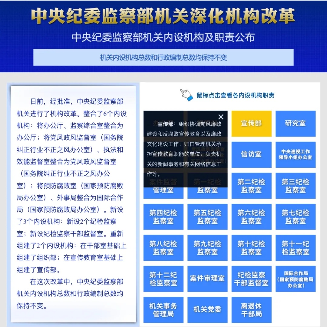 官方网站显示,中央纪委国家监委宣传部的主要职责是组织协调党风廉政建设和反腐败宣传教育以及廉政文化建设工作;归口管理机关承担宣传教育职能的单位;负责机关的新闻事务和有关网络信息工作等。