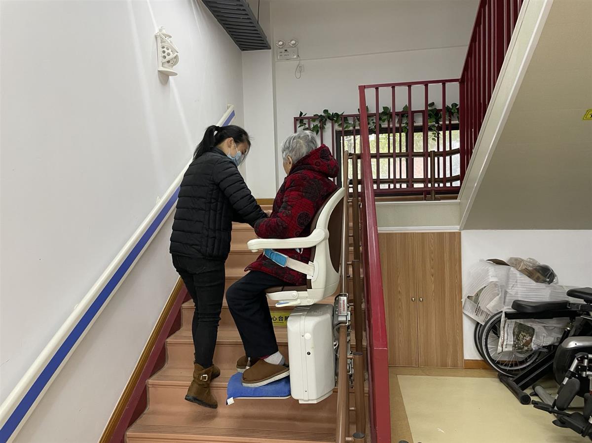 这里有专为老人定制的设施。中心建有上下两层,根据老人生活需求,配有单人间和多人间、活动厅、独立卫生间和康养室等。楼梯安有自动升降椅,由专人看护老人上下楼;卫生间内铺上防滑垫,配上U型扶手、折叠浴凳;康养室备有理疗床、烤灯,医养结合护理老人健康。