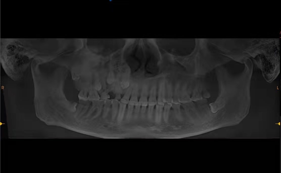 检查片上清晰可见,有3颗牙“埋伏”在鼻子部位。
