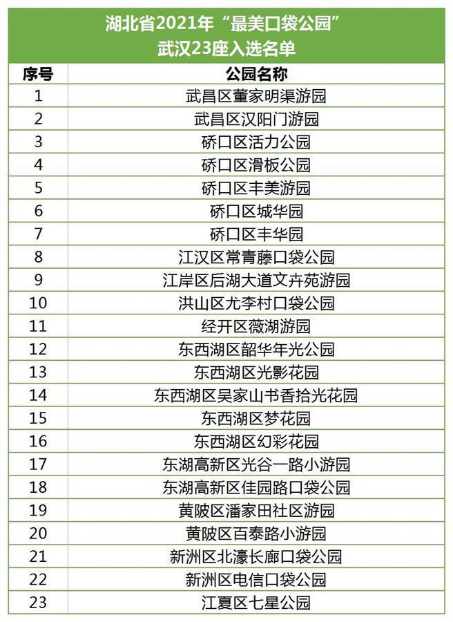 记者发现,23个武汉最美口袋公园中,硚口、武昌、洪山等中心城区的口袋公园有12个,江夏、新洲和经开等远城区的有11个,最美口袋公园绽放全城。“这说明武汉全市各区都在发力,绿化水平都在全面提升。”许伟说。