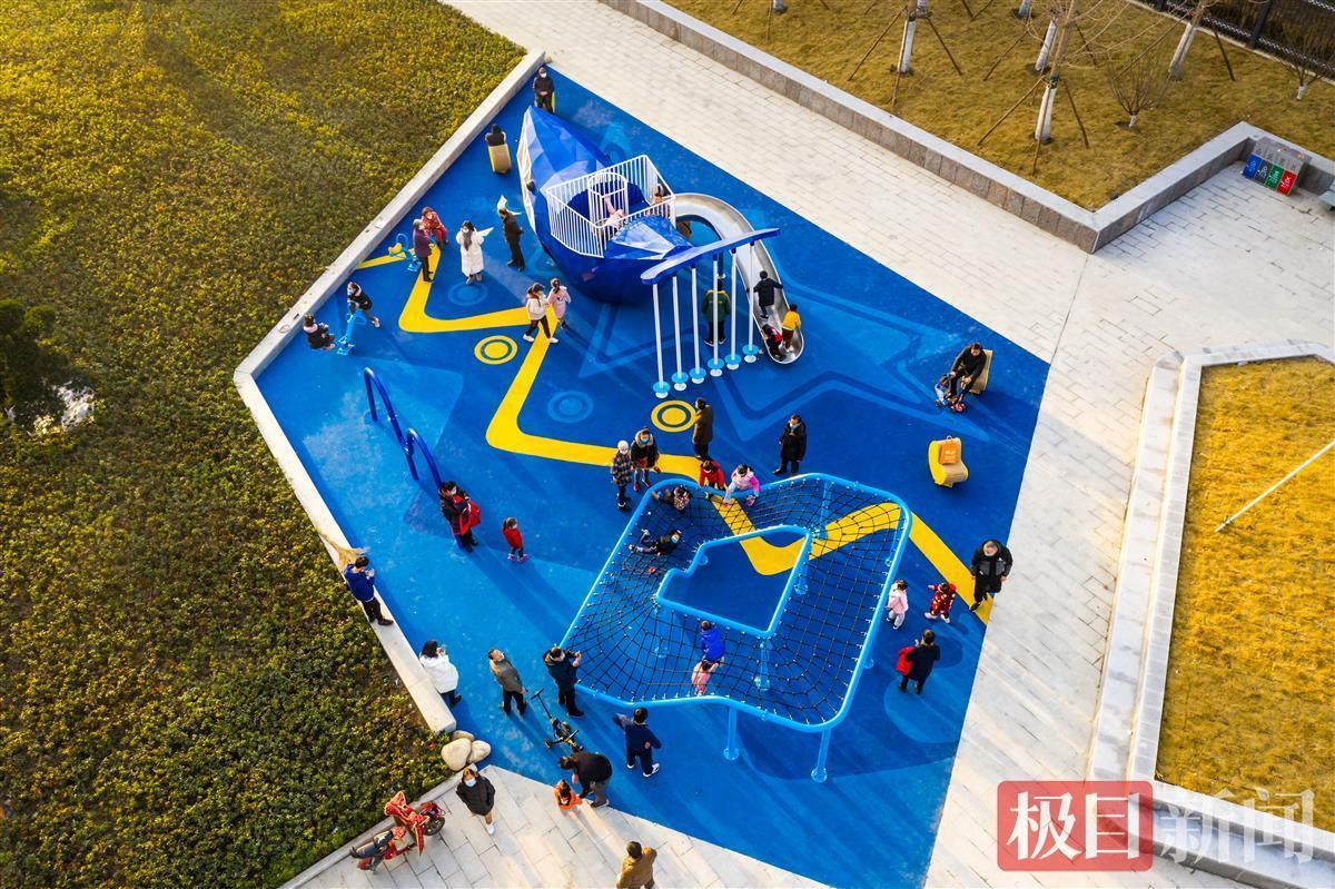 攀爬网、滑滑梯、荡秋千,相聚在一个以天空蓝底色的游乐圈,在底色上简笔勾勒的黄色波浪步道,巧妙形成黄蓝精彩撞色,这是江汉区发展大道与常藤街交汇处常青藤口袋公园带给周边居民的动感快乐。