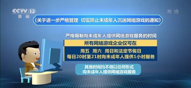 通知要求,严格限制向未成年人提供网络游戏服务的时间,所有网络游戏企业仅可在周五、周六、周日和法定节假日每日20时至21时向未成年人提供1小时服务,其他时间均不得以任何形式向未成年人提供网络游戏服务。