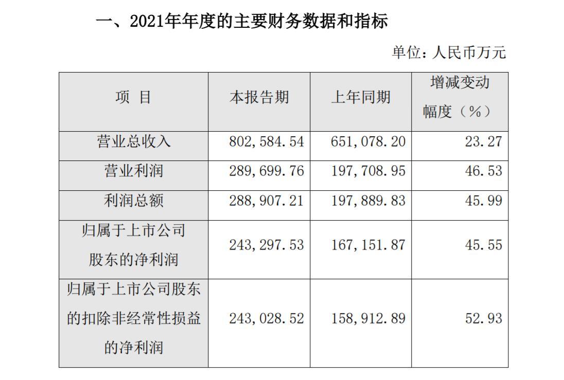 19日晚间,片仔癀披露2021年年度业绩快报显示,全年实现营业总收入80.26亿元,同比增长23.27%;归属于上市公司股东的净利润24.33亿元,同比增长45.55%;基本每股收益4.03元,上年同期为2.77元。